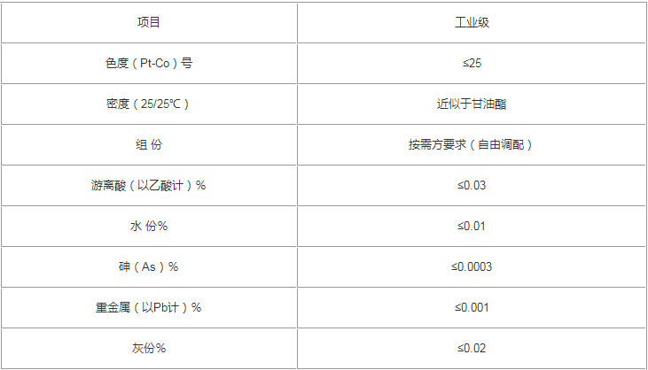 無色透明、無嗅油狀液體;微溶于水、易溶于醇、醚和其它有機溶劑。其它物化性能類似于三醋酸甘油酯。